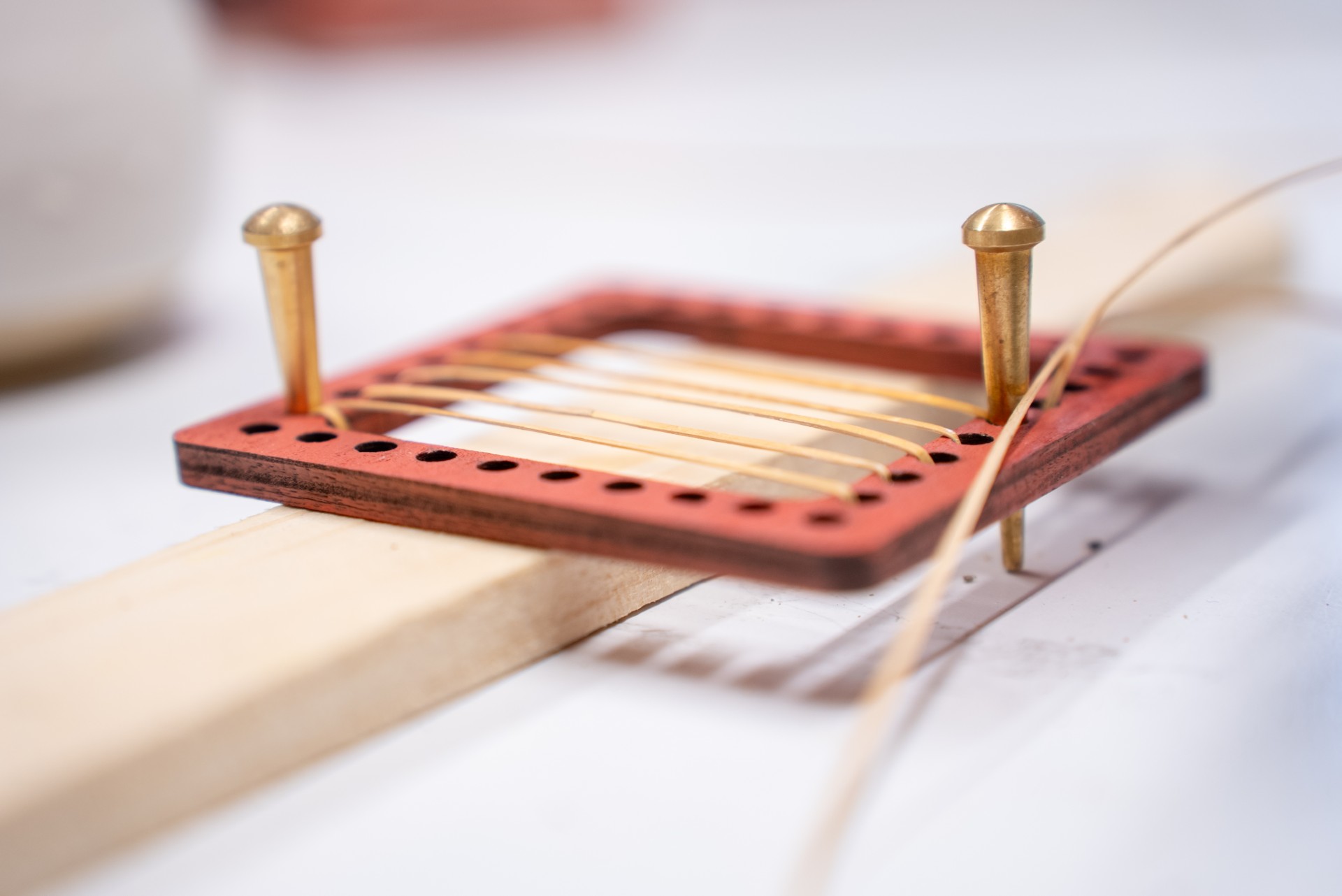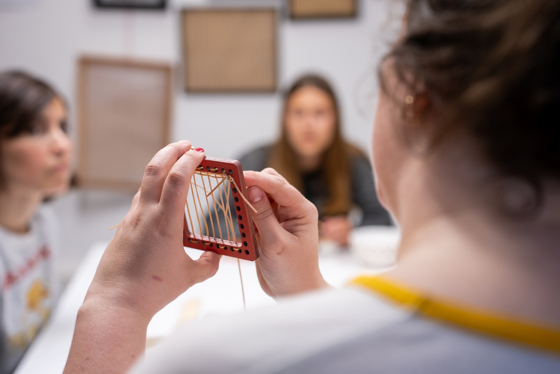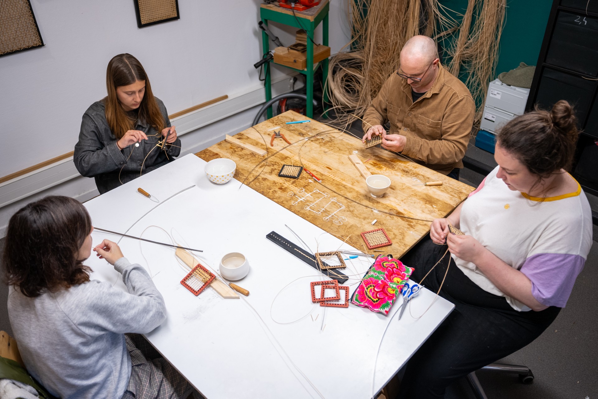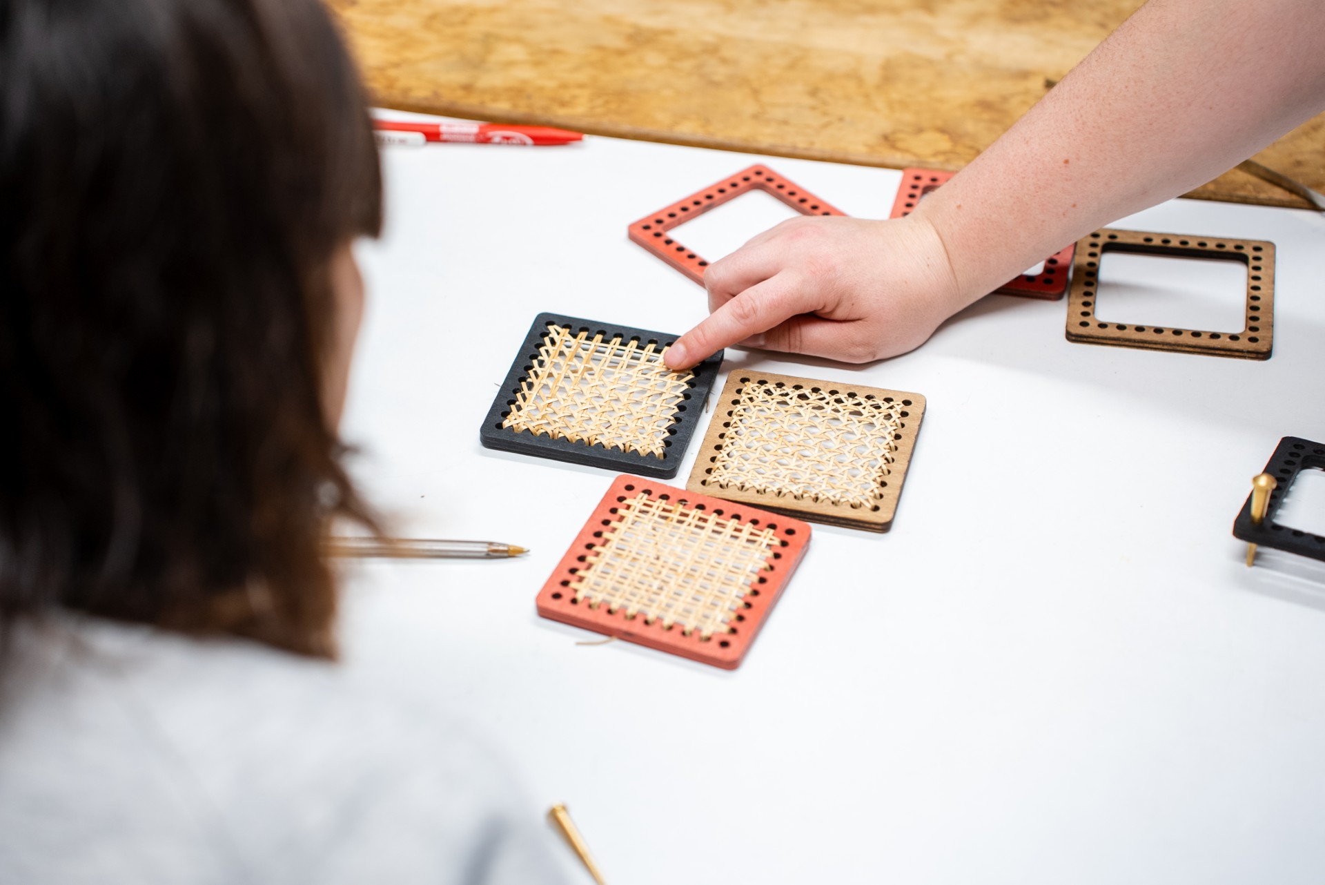 Ensuite, à vous de jouer ! Ines vous guidera pas à pas pour tisser la canne à travers le support, en vous montrant comment aligner, tendre et nouer les fils avec précision.